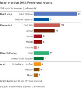 Netanyahu, sebbene duramente contestato, è il vincitore con molti problemi delle elezioni, il suo partito, è seguito a molta distanza da “C’è un Futuro” . Nella passata Knesset aveva 27 seggi, mentre il partito di Avigdor Lieberman “IsraelBeitenu” ne aveva 15. Invece di superare i 45, come il guru americano Arthur Finkelstein aveva previsto, ne hanno persi 11 dei 42 che avevano in liste separate.