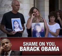 A destra, sotto alla foto coi parenti delle vittime israeliane, la scritta : "Vergognati, Obama!"