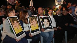 a destra, famigliari delle vittime del terrorismo palestinese con i ritratt dei loro cari assassinati
