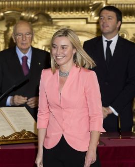 a destra, Federica Mogherini, al momento del giuramento, alle spalle Giorgio Napolitano e Matteo Renzi
