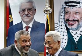 a destra, Ismail Haniyeh con Abu Mazen e una gigantografia di Arafat.