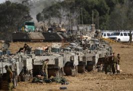A destra, truppe israeliane nei pressi di Gaza