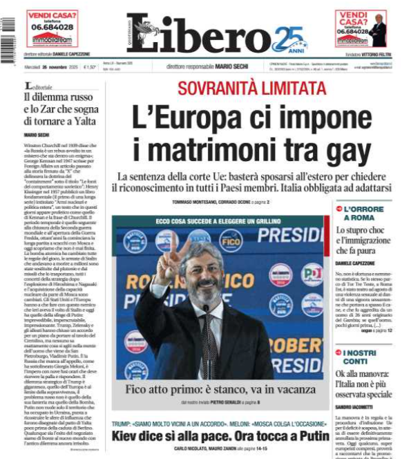 Testata: Libero Data: 26 novembre 2025 Pagina: 1/2 Autore: Tommaso Montesano Titolo: «Libero contro i matrimoni gay in Europa. Incredibile per un giornale 'liberale'. Sarà un errore»