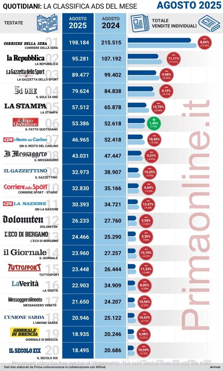 Secondo Agcom, si vendono 1,32 milioni di copie al giorno. Erano 1,9 milioni nel 2020. Significa un terzo dei lettori scomparsi in quattro anni. La copia cartacea sta scomparendo. Il digitale? Un miraggio: cresce appena dell’1,7 per cento.