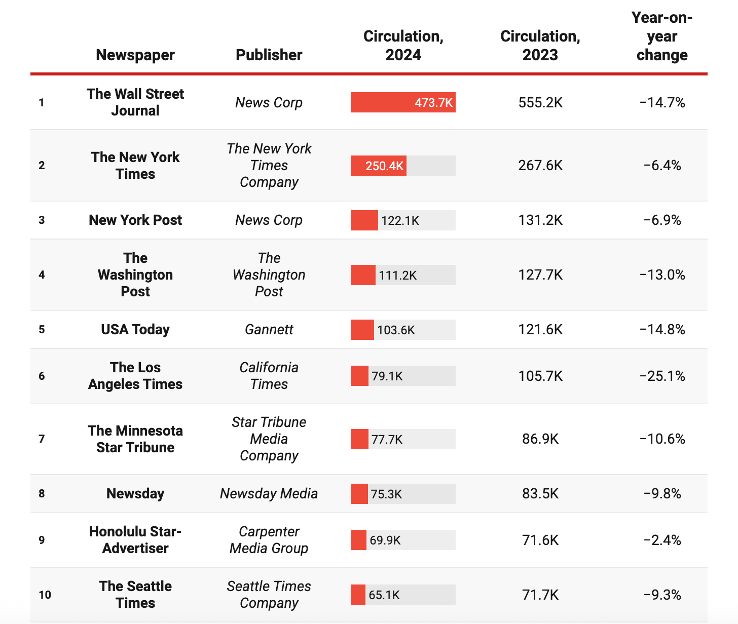 “Dal 2005, il numero di quotidiani pubblicati negli Stati Uniti è sceso da 7.325 nel 2005 a 4.490 oggi. La diffusione dei quotidiani, che all’inizio del secolo si aggirava in media tra i 50 e i 60 milioni di persone, ora supera di poco i 15 milioni. Si stima che nel 2005 lavorassero nei quotidiani 365.460 persone, mentre ora il numero è sceso a 91.550”.