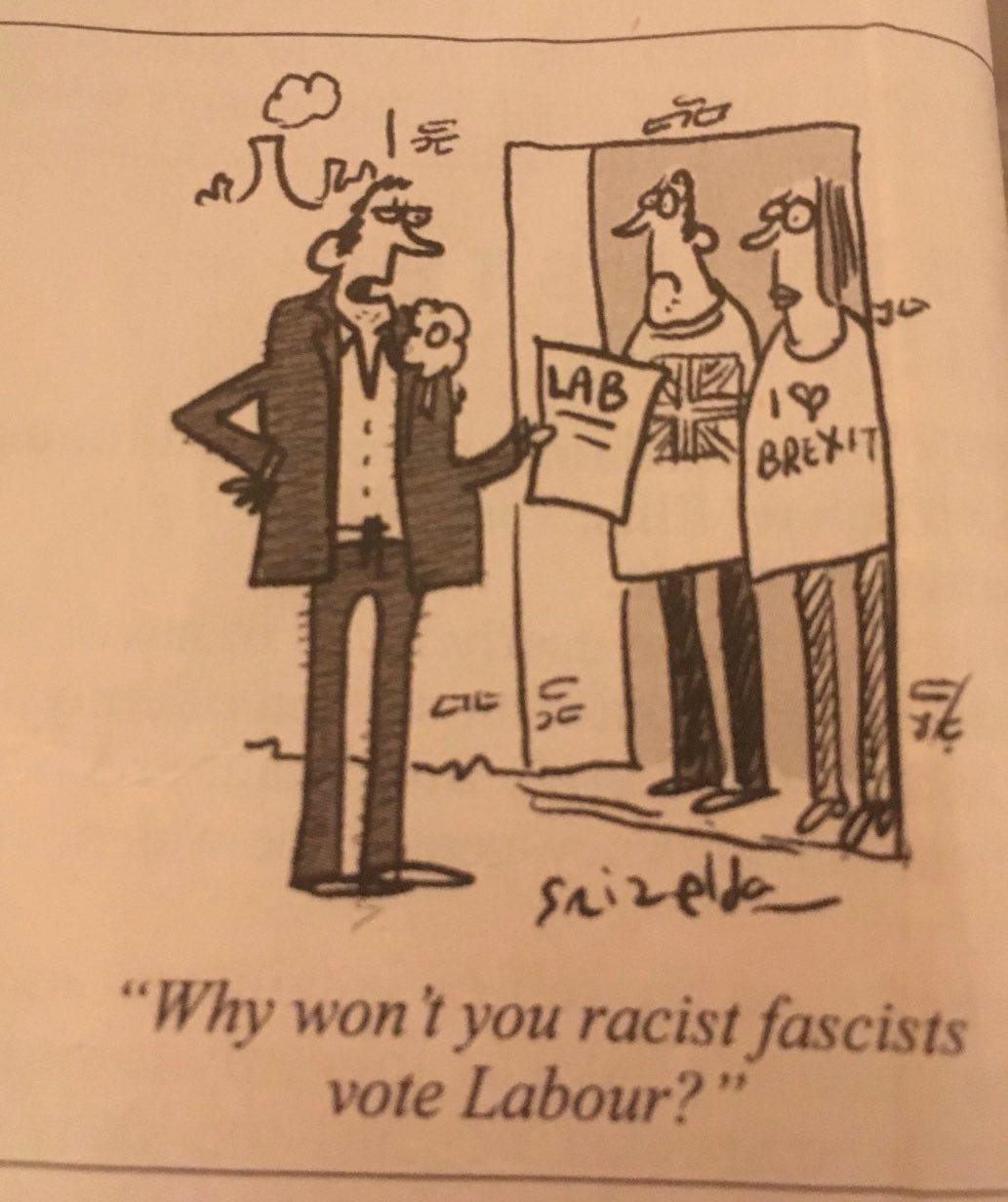 Come nella vignetta del giornale beitannico Private Eye: un candidato laburista che si avvicina a due elettori della classe operaia e chiede loro: “Perché voi fascisti razzisti non votate laburista?”.