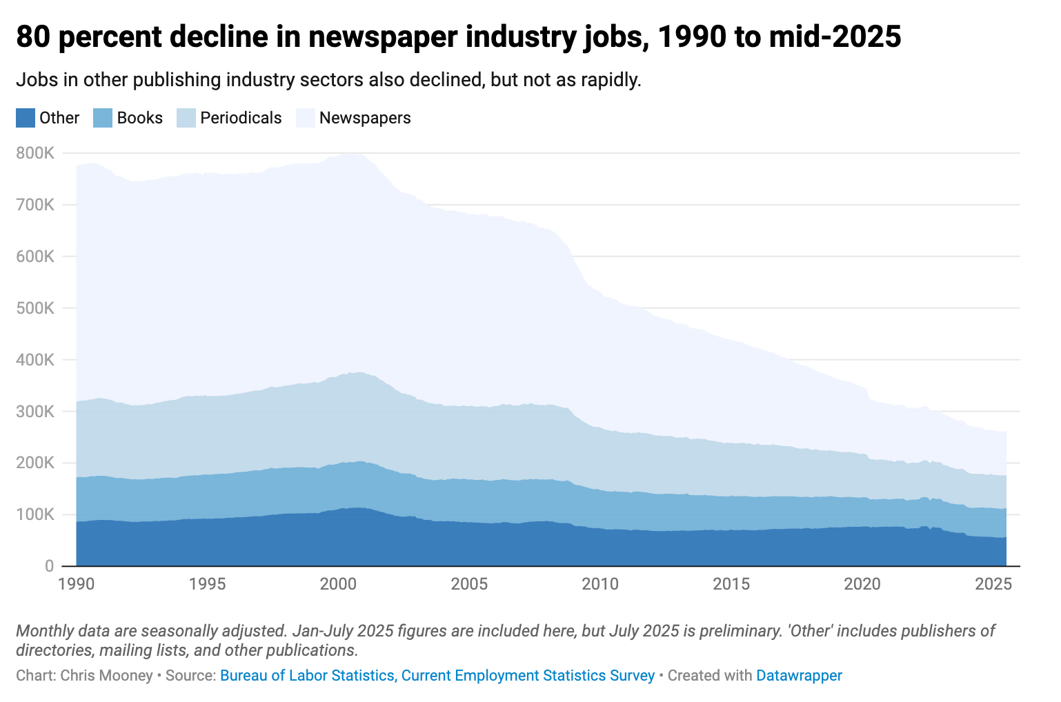 Dal 1990 al 2008, il 25 percento dei posti di lavoro nei giornali sono scomparsi.