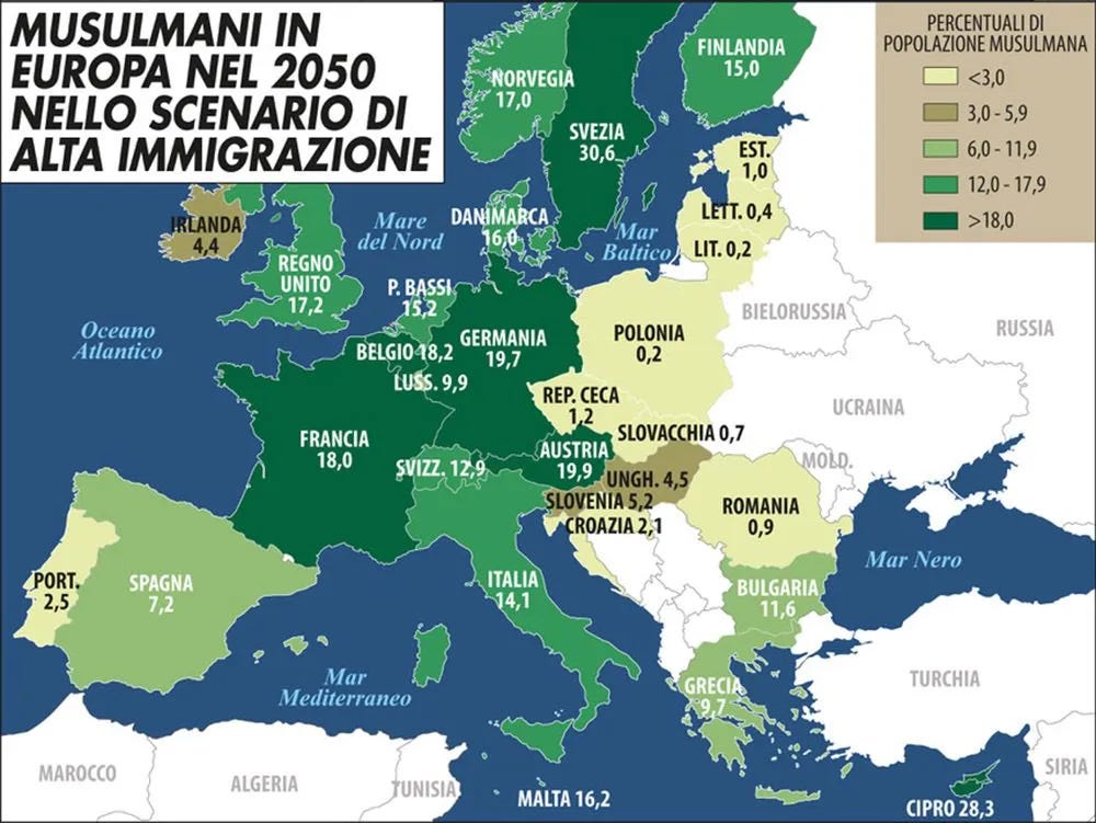 Nel 2050, secondo il Pew Forum, i musulmani saranno almeno il 15 per cento della popolazione italiana. E qualche anno dopo fino a un quinto degli italiani, secondo l’agenzia europea Eurostat, avranno un background migratorio. Numeri che avranno un effetto dirompente in un “paese potenzialmente da 32 milioni”, come ha predetto l’ex presidente dell’Istat Giancarlo Blangiardo a proposito del nostro harakiri demografico entro due generazioni.