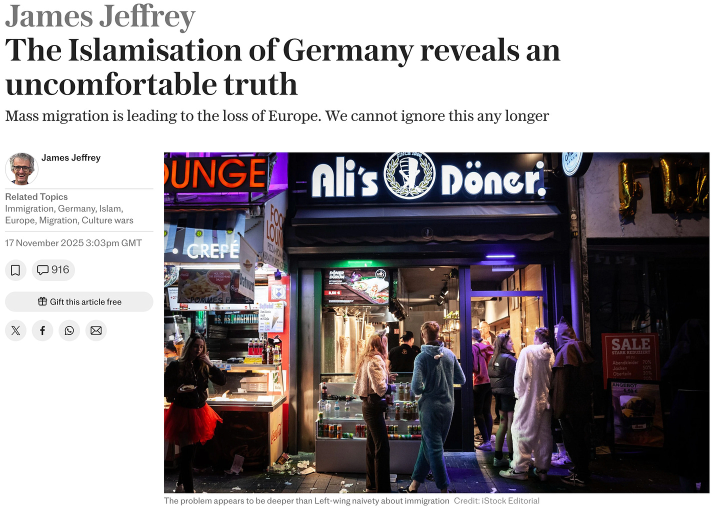 Il Telegraph britannico guarda alla Germania come a un paese che rischia di scomparire sotto l’enorme pressione di un’immigrazione culturalmente estranea. L’analisi dell’ex ufficiale britannico James Jeffrey è il resoconto di un uomo che ha visto zone di guerra e ora osserva le nostre città stranamente familiari.