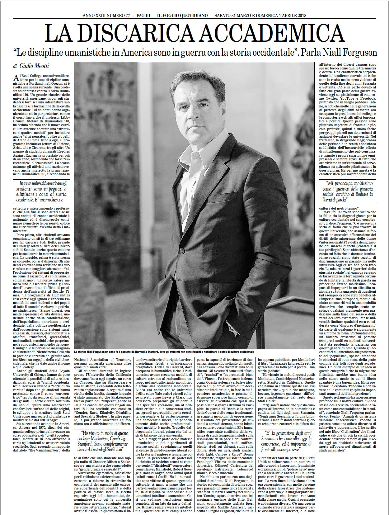 Qualche anno fa intervistai Niall Ferguson sulla “discarica accademica” e mi disse: “Il suicidio è ciò che la civiltà occidentale dovrebbe temere di più. E vedo oggi un desiderio strisciante di morte all’opera nei dipartimenti di studi umanistici”.