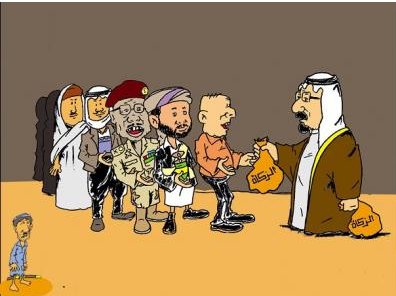 Questo è apparentemente il più grave di tutti i problemi che affliggono la società del regno saudita. L’identità nazionale è definita da un gruppo di valori, ideali e princìpi che, insieme, costituiscono l’identità di individui e gruppi tra la popolazione. Sono espressi nell’ arte, cultura, letteratura, filosofia e storia. Alcune di queste componenti sono fisse e immutabili, altre integrano i cambiamenti che stanno avvenendo all’interno della società. In Arabia Saudita, i giovani, che costituiscono la maggioranza della popolazione, possono essere suddivisi in tre gruppi secondo la loro identità culturale: il primo gruppo ha un’inclinazione alla tradizione, caratterizzata da costumi e tradizioni sociali specifiche, in particolare dall’adesione alla cultura tribale, che è recentemente aumentata fra la popolazione e nei media. La crescente consapevolezza dell’unità tribale, fra quelle che non fanno parte della coalizione della famiglia saudita, si traduce in una maggiore indipendenza e consapevolezza di sé, isolando questo gruppo legato al governo. Il secondo gruppo integra i valori religiosi con altri importati, che piacciono soprattutto alle giovani generazioni. Si vedono tanti giovani che vanno a pregare nelle moschee in jeans e con i capelli tagliati in stili occidentali, in tasca hanno telefoni cellulari che contengono materiale in contrasto con i valori dell'Islam. Questi giovani non rappresentano un elemento stabile della società, e il loro comportamento può cambiare in breve tempo. Il terzo gruppo è composto da giovani che vengono sempre più attratti dal lato estremista della religione, che la vivono come una vera e propria bussola, una guida per l’individuo, la società e lo Stato. Questo gruppo considera negativamente la cultura tribale, in particolare il suo sovrano, soprattutto a causa di voci sul comportamento immorale di alcuni membri della famiglia reale. A tutti questi gruppi si aggiungano i milioni di lavoratori stranieri che risiedono stabilmente nel regno, la maggior parte dei quali - sia dal Bangladesh, Malesia, Indonesia che dal mondo arabo - lavorano in condizioni difficili e per salari molto bassi, e molto spesso ricevono un trattamento umiliante e degradante dai loro datori di lavoro sauditi. Le donne straniere che lavorano come colf in Arabia Saudita sono trattate con una doppia dose di umiliazione e sfruttamento. La considerazione che lo Stato ha di loro equivale allo stipendio che ricevono per il loro lavoro. La famiglia regnante è ben consapevole delle varie tendenze tra la popolazione, e cerca di conquistarsi la lealtà del popolo con la distribuzione mirata di finanziamenti. Una caricatura che sta girando su Internet esprime bene la situazione.