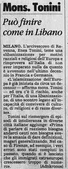 Era il 1990 quando l’arcivescovo di Ravenna, Ersilio Tonini, che non è mai stato di destra, denunciò la “libanizzazione” in arrivo e rimproverò l'Italia di non aver imparato nulla da quanto stava avvenendo in Francia e Germania. “L'islamizzazione dell'Europa è già iniziata da circa un decennio - disse Tonini - e ora c'è il rischio, anche per l'Italia, di una libanizzazione”.